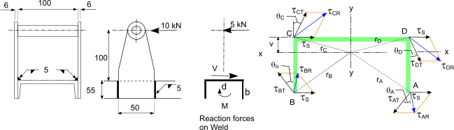 It is necessary to locate the point subject to the highest shear stress..For a weld subject to only torsion this would be simply at the point furthest from the COG. However because the weld is subject to torsion and direct shear the problem is more complicated. A normal method of determining the stresses in these cases is to use vector addition.