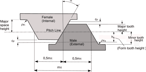 An example set of designations for a mating spline pair with 32 teeth, 2,5 module, with a 30°pressure angle, a fillet root and a class 5 fit is...