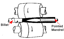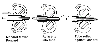 A heated tube is reciprocated under cam shaped rolls. First the tube is moved forward under the rolls. The profiles of the rolls are shaped so that on rotation they bite into the tube to force it down onto the mandrel. The mandrel is then moved back to drag the tube against the rolls and smooth its outside diameter. The cycle is repeated. Tube drawing If cold drawn seamless tubing is require with small diameters, thin walls, or a smooth surface finish then the tubes manufacturing process is completed using cold drawing.
