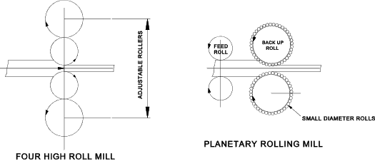 Introduction Forging dates back to ancient times and was associated with the village blacksmith. Virtually all ductile metals may be forged by first preheating the work piece to a forging temperature. The work piece can be a billet, a wrought bar, a cast or sintered ingot etc. The forging process can then be completed by hammering the work piece to the desired shape. 1) Open Die/hammer or smith forging Open die (smith forgings) are made by using steam or air hammers or presses in conjunction with blacksmith tools or flat type dies. There is little lateral confinement of the work piece. The desired shape is obtained by manipulating the workpiece between blows. This process is based on hammering the work pieces into into the desired shape by means of closing dies. The hammering or pressing is performed, respectively, by a mechanical or hydraulic press. Small and medium sized forgings are generally made in presses ranging in capacity from 500 to 10000 te. In this process a slow squeezing action is used to form the metal. The slow squeezing action penetrates the entire workpiece allowing the process to be used for the forging of large objects. Press forges are made in sizes of up to 50,000 te. Upt to 15000 te the presses may be mechanical or hydraulic. The larger presses are always hydraulically powered. This process uses barstock which is heated at the end which is being forged. The bar is gripped in the fixed half of a die so that the length of material being forged projects. The forging blow is delivered by a moving die. Simple shapes are produced in a single stage but more complicated shapes require multiple stages. Swaging is the forging method used for sizing, pointing, tapering, and otherwise shaping of the ends of rods or tubing. Rolling Rolling is the most important metal working process and can be performed on either hot or cold metal. Material is passed between cast of forged steel rolls which compress it and move it forward. Rolling is a economical method of deformation if metal is required in long lengths of uniform cross section. Normal rolling achieves thickness reduction of about 2:1. Slabs and blooms.Ingots are first rolled into either rectangular slabs or square blooms which are produced as intermediate stages. In this rolling process the ingots are passed through the plain rolls repeatedly in one direction and then in the reverse direction at each stage the rolls are brought closer together. If square blooms are required the material is rotated through 90o between rolling operations. Plates Strips and Sections.The rolling process can be used to produce plates, strips and rolled sections including channels, Universal Columns angles sections etc. The plates and strips are generally formed using plain rolls. The rolls can bow which results in the plate being thicker at the middle. The rolls can be backed up in four high roll arrangements. with additional rolls to reduce this tendency.. Planetary rolling millsSmall diameter rollers are more effective than large ones in conveying rolling forces to deforming metal. Planetary mills take advantage of this principle. This process can achieve thickness reductions of up to 25:1