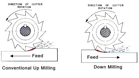 Horizontal Milling Feed Direction The direction of feed in relation to the direction of cutter rotation is and important factor in horizontal milling. Conventional up milling requires that the workpiece is fed against the rotation of the cutter. In down milling the workpiece moves in the seam direction as the surface of the rotating cutter. The tow alternatives are shown in the figure below