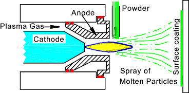The anode surface area should be at least 1,5 times the cathode area and the current , for this application should be about 50 amperes per m2. The direct current voltage varies from about 0,5 to 2V. Cadmium Plating Most cadmium produced is electroplated onto steel, iron, copper, brass, and other alloys to protect them from corrosion. Cadmium plating is especially resistant to attack by alkali. Some is used as the anode material in rechargeable batteries in which the oxide of nickel or silver is the cathode. convenience of application, Anodising This process is and electochemical process generally applied to Aluminium although the process is also used for magnesium, titanium, zinc and magnesium. Anodising is an electrolytic passivation process used to increase the thickness and density of the natural oxide layer on the surface of metal parts. Anodising provides corrosion resistance and surface hardness,and is electrically insulating. The anodised finishes are often porous. The porous surfaces can be dyed any colour which makes the process useful as a decorative finish. Thermal Spray Coatings The Plasma Spray Process is basically the spraying of molten or heat softened material onto a surface to provide a coating. Material in the form of powder is injected into a very high temperature plasma flame, where it is rapidly heated and accelerated to a high velocity. The hot material impacts on the substrate surface and rapidly cools forming a coating. This plasma spray process carried out correctly is called a "cold process" as the substrate temperature can be kept low during processing avoiding metallurgical changes and distortion to the substrate material.