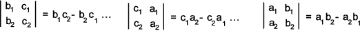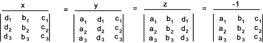 An example of solving 3 linear equations can be expressed as a1x + b1y+ c1y + d1 = 0 Using determinants this is solved by the following relationship<