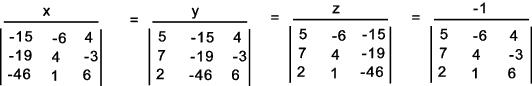 On evaluating the denominators. ( x /-1257 ) = ( y /-1676 ) = ( z / -2514 ) = ( -1 /419 ) Dividing each denominator by 419 results in ( x /--3 ) = ( y /-4 ) = ( z / -6 ) = -1 This results inx = 3: y =4: z =6 |