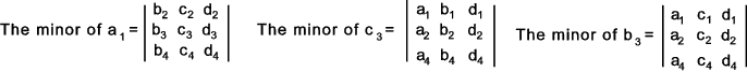 If the row and column of any element is deleted then a reduced order determinant remains which is called the minor determinant of the element in question..e.g. considering the fouth order deteterminant above..