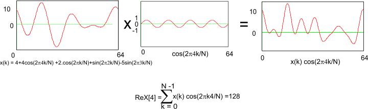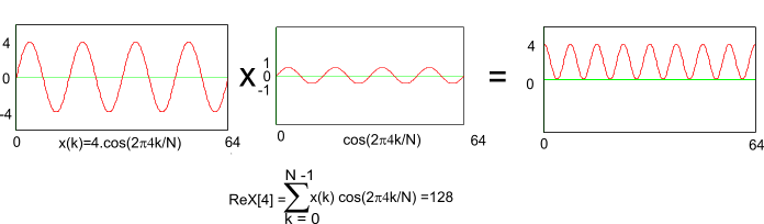Considering a signal of N points. To detect a specific waveform contained in this signal, multiply the signal amplitude by the waveform amplitude at each time interval and add all the points in the resulting signal. The result of this operation will be zero if the signal does not contain the specific waveform. If the signal contains waveform then a positive value will result. For example: if the signal has an amplitude of 4 and includes 4 cycles over N= 64 points and the specific waveform also completes 4 cycles over N = 64 points then the result is as shown below. For all other signal frequencies the result will be zero.