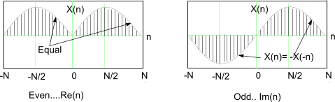 For even functions the amplitudes X(-N/2 to 0) = X(N/2 to N) and for odd functions X(-N/2 to 0) = -X(N/2 to N ) . This results from the frequency domain being periodic about zero frequency and for a period N the frequencies from 0 to N/2 are mirror images of the frequencies of 0 to -N/2. The frequencies from -N/2 to 0 have equal magnitude as the the frequencies from N/2 to N. This is illustrated by the figure below