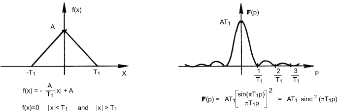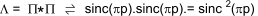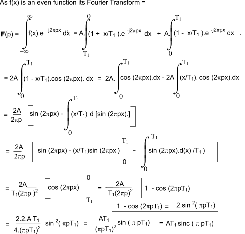 The Fourier Transform of a unit Triangle FunctionΛ (1 unit high and 2 units wide) is easily obtained as the convolution of two unit Top Hat (rectangle) Functions Π each 1 unit wide and one unit high which results from the product of the Transforms of the functions...