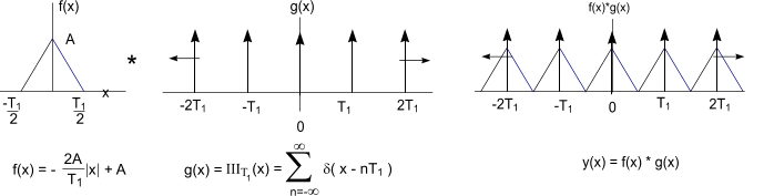 10) Fourier Series from Fourier Transforms Considering a Triangle Function above. This is single entity. To produce a periodic expansion it is necessary to perform a convolution operation with a Dirac comb as follows