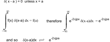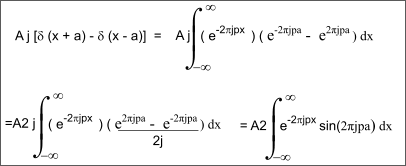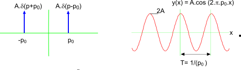 6) Two symmetrical dirac Functions. If two δ-functions are symmetrically positioned on either side of the origin the fourier transform is a cosine wave. A.δ( x - a ) + A.δ( x + a )