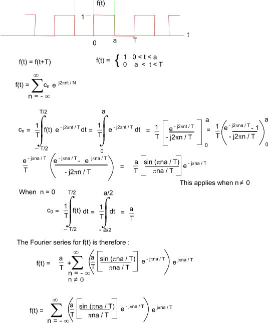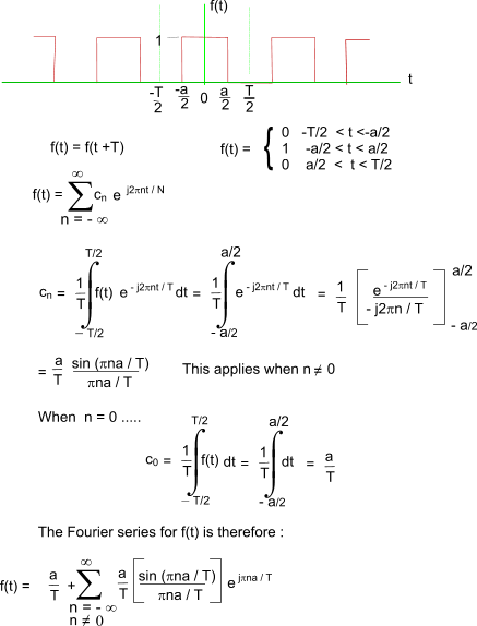 Introduction The very high percentage of the science of physics involves vibrations and waves. Mechanical engineering, electrical engineering, fluid mechanics , sound and vision engineering etc all involve vibration and waves. The detailed analysis of vibrations and waves generally involves the use of fourier transforms. A fourier transform at is most basic level involves transforming a complex waveform into a form which is easily assessed. A most convenient analogy is the transformation of a chord played by a musical instrument into a formal discription of its component notes. Another useful analogy is when light passes through a prism and is broken down into its component primary colours. Complex exponentials representation of Fourier Series The following identities show exponential - trigonometric relationship