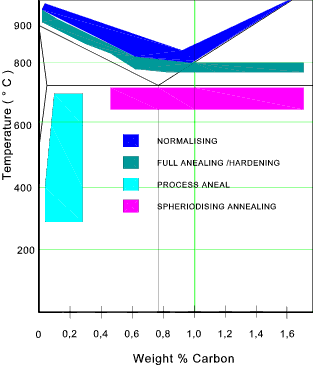 Normalising involves heating the steel to about 40oC above its upper critical limit. The steel is then held at this temperature for a period of time and is then cooled in air.. It is desireable that the temperature of the steel shall be maintained for a time period more than 2 minutes per mm of section thickness and shall not exceed the upper critical temperature by more than 50oC.