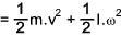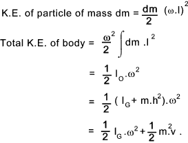 If the centre of gravity of a body is moving with a velocity v and is rotating with and angular velocity of w about the centre of gravity. The total K.E. = K.E. of translation + K.E. of rotation