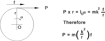 When considering motions of machines with comprising masses in linear motion and masses with and angular motions it is often required to find the equivalent mass of a rotating body. This occurs often with vehicle dynamics. In considering a body of mass ( m ) rotating about an axis through O with a tangential force at radius ( r ) producing a linear accelaration at this point of ( f ) with and a resulting angular accelaration of (α ).