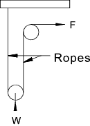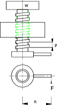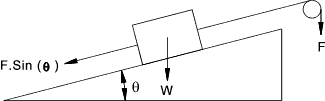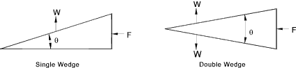 The force Force (F) is the effort required to move the Weight (W) up the slope. A movement of the weight a distance x along the incline will result in a vertical displacement of x Sin(θ)). Assuming that the incline is frictionless the F required to move the weight up the slope = W Sin(θ)). Velocity ratio = 1 /Sin(θ) Wedge