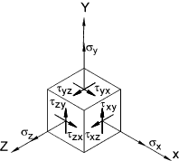 The figure below shows a stress element and illustrates the method of identifying normal and shear stresses. The directions are all positive