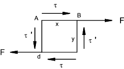 The element assumed to be 1 unit thick and the couple resulting from the shear stress τ = τ .x.y. For equilibrium there must be a couple from a complementary shear stress τ ' this resulting couple will be τ '. y.x.