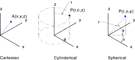 - The Cylinderical Co-ordinate System with a radius (r) and an angle θ from the x axis towards the y axis and a z co-ordinate (length of cylinder)