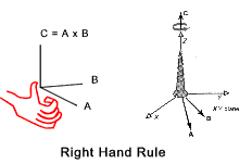 The right-hand rule states that the orientation of the vectors' cross product is determined by placing A and B tail-to-tail, flattening the right hand, extending it in the direction of A, and then curling the fingers in the direction that the angle B makes with A. The thumb then points in the direction of A x B.
