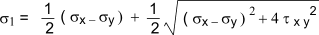 According to this theory failure will occur when the maximum principal stress in a system reaches the value of the maximum strength at elastic limit in simple tension. For the two dimensional stress case this is obtained from the formula below (ref page on Mohrs circle).