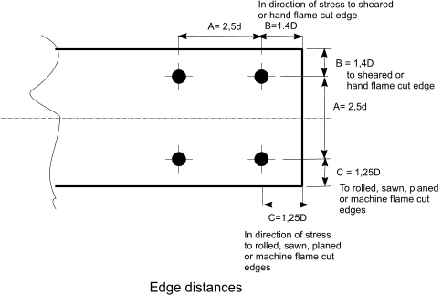 It must be stated that connections under tension with the end edge distance (b = 1,4 D) cannot withstand the full load that is possible with the bolted connection. An end distance of B = 2D is required to achieve this maximum strength.