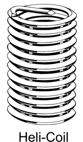 The helical wire inserts inserts, generally identified by the tradename Heli-coil, are made from diamond shaped wire formed into coils. They are screwed into tapped holes such that the resulting internal profile of the coil is that of the desired female thread. The tapped hole is created using a special tap . The insert is over-sized so that it anchors itself into the hole. Some have tangs to enable convenient install but some do not. Special tools are required to install the inserts. When the insert includes a tang , it is snapped off after installation. The insert can be configured to provide a thread locking duty.