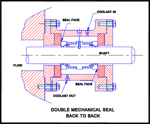 - Back to Back - Used when an abrasive fluid is being contained and both seals are flushed with a clean buffer fluid. The flushing fluid is introduced at a higher pressure the process fluid