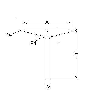 | M = Mass per m , A= Width of Section, B= Depth of Section,T= Flange Thickness, T1 = Top Web thickness, T2 = Bottom Web thickness, R1 = Root radius, R2 Toe Radius Area = Area of Section, S = Slope Inside Flange |
