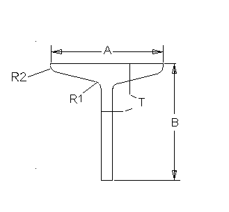 | M = Mass per m , A= Width of Section, B= Depth of Section, T = Flange/Web Thickness, R1 = Root radius, R2 = Toe Radius. Area = Area of Section, S = Slope Inside Flange |