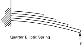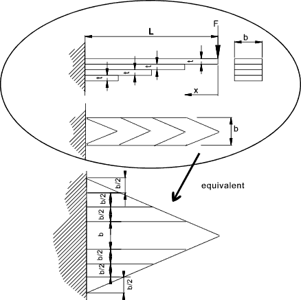 Considering a cantilever type leaf spring, the stress distribution is related to the distance from the load point. σ = 6Fx / bt2 If (x/b) is constant along beam, of constant thickness t, then the stress level will be constant and the most efficient spring will result. If x/b is constant then a triangular shaped spring results. The multileaf spring is designed to provide a constant stress level along the spring length as it is designed to be equivalent to a triangular spring as shown below.