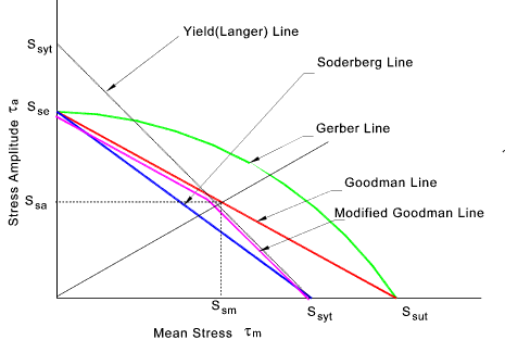 Ssf is the modified shear fatigue strength. This can be determined approximately if the endurance limit( S'se ) and the fatigue strength at 103 cycles ( S'sl ) are available ref High cycle fatigue strength Goodmans failure criterion.. The fatigue design of springs generally involves one of a number of failure criterions, as shown below.
