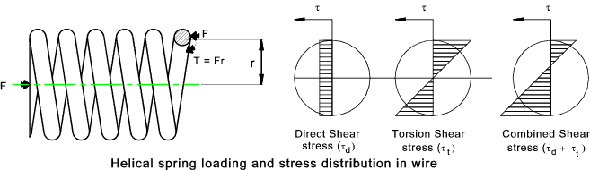 Consider a compression spring under an axial force F. If a section through a single wire is taken it can be seen that, to maintain equilibrium of forces, the wire is transmits a pure shear load F and also to a torque of Fr.