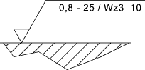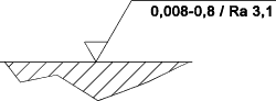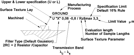 General Representation![]() The Specification limit can be a) max. i.e no part of the measure profile exceed the stated limit. b) 16%-rule (default) i.e. 16% of the evaluated profile can exceed the stated limit Reference BS EN ISO 4288:1998 Surface Texture Parameter includes a Profile letter and a Characteristic letter Profile Letter... a) R for Roughness b) W for Waviness c) P for Profile (Form) Characteristic.. a) p = Maximum mean to peak (In sample length) b) v = Maximum mean to valley(In sample length) c) z = Maximum peak to valley(In sample length) d) c = Mean Height of Profile Irregularities(In sample length) e) t = Maximum hight of profile deepest valley to highest peak(In sample length) f) a = Average Roughness. The average roughness is the area between the roughness profile and its mean line(over the evaluation length) g) q = The root-mean-square (rms) average roughness file(over the evaluation length) h) sk =Skewness..Indication of high spikes or deep local valleys (over the evaluation length) h) ku - Kurtosis .. Indication of general spikeness (over the evaluation length) The Filter parameter is rarely shown on drawings and indicates the type of filter used. The normal type used now is the Gaussion filter. This is the default and does not have to be indicated. The older 2RC (2-resistor-capacitor) analogue type when used is indicated. The Evaluation length Is indicated as a multiple of the sample length only if it is different to the default of 5 ![]() Description No material removal allowed, unilateral upper specification limit, default transmission band. R-profile, maximum height of roughness 0,5mm, evaluation length of 5 sample lengths (default), "16 % rule" (default). ![]() Description Machined finish, unilateral upper specification limit, default transmission band. R-profile, maximum height of roughness 0,3mm, evaluation length of 5 sample lengths (default), "max- rule" applies. ![]() Description Machined finish, unilateral upper specification limit, transmission band 0,008-0,8mm R-profile, arithmetic mean deviation 3,1mm, evaluation length of 5 sample lengths (default), "16% rule " (default) applies. ![]() Description Machined finish, unilateral upper specification limit, transmission band ls = 0.0025mm (Default-BS EN ISO 3274) Sample Length 0,8mm R-profile, arithmetic mean deviation 3,1mm, evaluation length of 3 sample lengths, "16% rule " (default) applies. ![]() Description Machined finish, unilateral upper specification limit, transmission band 0,8 -25mm W-profile,maximum height of waviness 10mm, evaluation length of 3 sample lengths, "16% rule " (default) applies. |