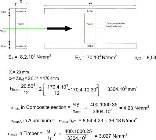 Note :A detailed list of modifying factors is provided on webpage Modifying Factors. Thereforeσm.adm,ll = σm.g,ll. K2.K3.K6.K7.K8 σm,ll = Calculated bending stress parallel to grain This method is used in BS 5268 and is used in the examples provided below 2) Load Factor Design Working Loads x Factor of Safety ≤ Ultimate strength of timber at Failure This method is not considered further in these notes. 3) Limit State Design Ultimate design load ≤ Ultimate capacity This method is used in most modern timber design codes including Eurocode 5. Beams..Bending Moment Diagrams and Shear Force Diagrams for beams The nomenclature and sign convention for timber beams to BS 5268 is the same as that indicated on webpage Bending Moment - Shear Force Diagrams Bending Stresses The bending beam theory for timber beams is similar as that indicated on webpage Beam Theory Shear Stresses The stresses resulting from tranverse loading of timber beams is similar as that indicated on webpage Shear stress Composite Sections Timber beams used in construction are often fabricated from different materials e.g an I section beam can comprise softwood flanges with a ply-wood web. The design of composite sections is illustrated on webpage Composite Sections Example of a composite section calculation Consider a composite section as shown below subject to a maximum bending moment of 400 Nm. What is the maximum stress in the timber section and the maximum stress in the Aluminium section
