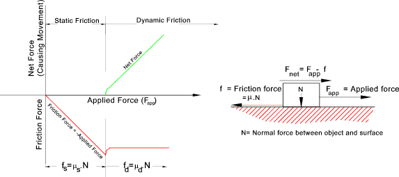 When the tangential force F overcomes the frictional force between two surfaces then the surfaces begins to slide relative to each other. In the case of a body resting on a flat surface the body starts to move. The sliding frictional resistance is normally different to the static frictional resistance. The coefficient of sliding friction is expressed using the same formula as the static coefficient and is generally lower than the static coefficient of friction..