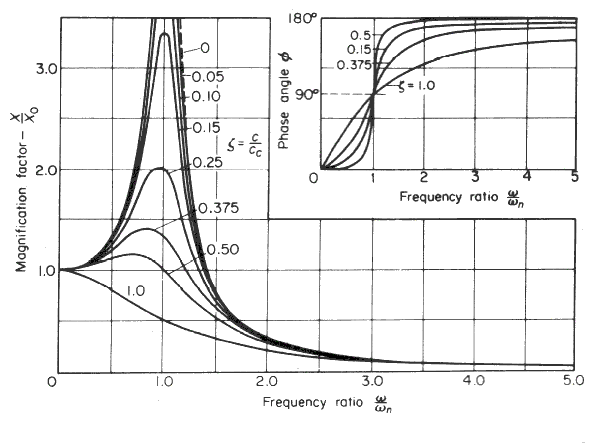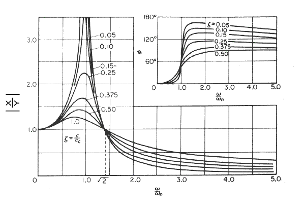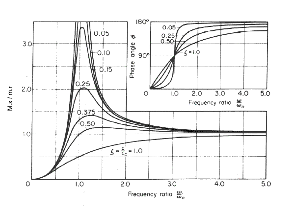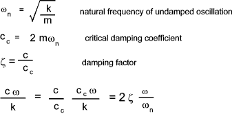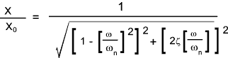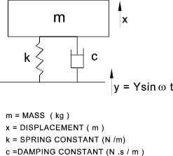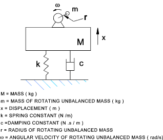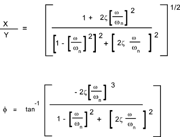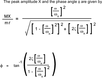 ![]() Rotating Unbalanced Mass For the case of a mass M supported on springs k with viscous damping c which is supporting a rotating unbalanced load of mass m rotating with and angular frequency ω at a radius r . The peak amplitude and phase are provided by the following dimensionless expressions ![]() ![]() ![]() Excitation of Base For the case of a mass m supported on springs k with viscous damping c on a base which is moving with an excitation of form y = Y sin ω t . ![]() The ratio of peak ampltude of the mass and the base and the phase are provided by the following dimensionless expressions ![]() ![]() |